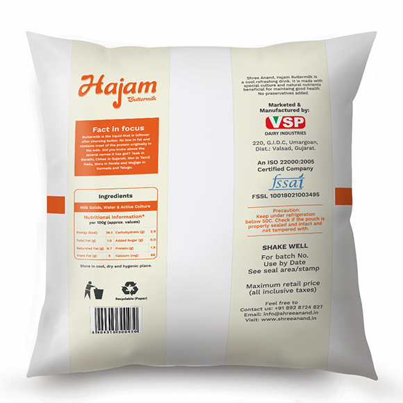 Hajam Buttermilk from Shree Anand is the perfect solution to improve digestion related issues. With 1% fat and up to 0.8% acidity, Hajam Buttermilk helps in enhancing gut health. The product is readily available in 200ml and 500ml pouch and 200ml tetra pak and can be consumed directly.