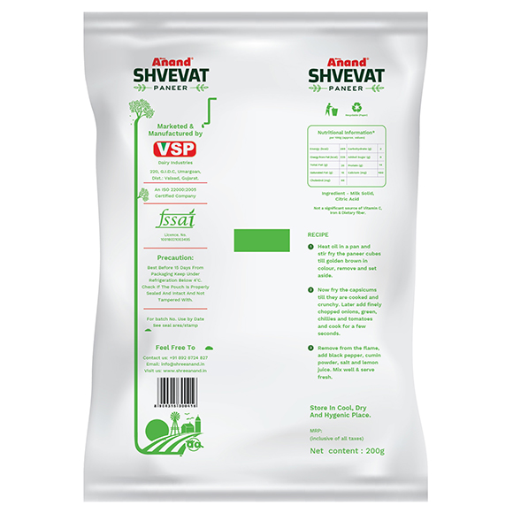 Shvevat Paneer from Shree Anand is a wholesome source of protein. Composed of milk solids, pure and hygienic, the paneer has a soft, smooth and uniform texture. It is available in 200gms pouch and is rich in fat and low in moisture.